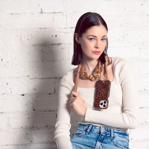Coque iPhone avec étui en cuir imprimé léopard anneaux dorés COQUE IPHONE CUIR PORTE CARTE AVEC ANNEAUX LOU  LEOPARD avec cordon tessa marron