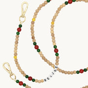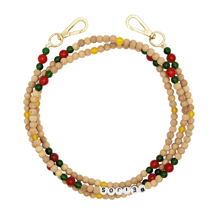 Bandoulière détachable en perles de bois, le mot "Beijos" et deux mousquetons dorés