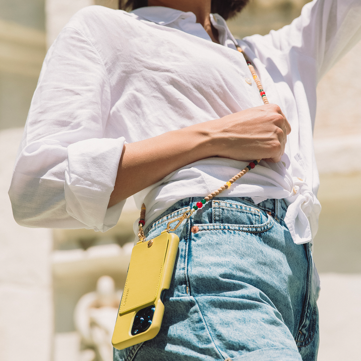 La bandoulière ARIELLE en perles de bois, faite à la main, c'est du bonheur garanti ! Grâce à ses 2 mousquetons en métal doré, elle peut être fixée à tous nos modèles de coques portables. La bandoulière a une longueur de 125cm (mousquetons inclus) et peut être portée en bandoulière ou en collier.