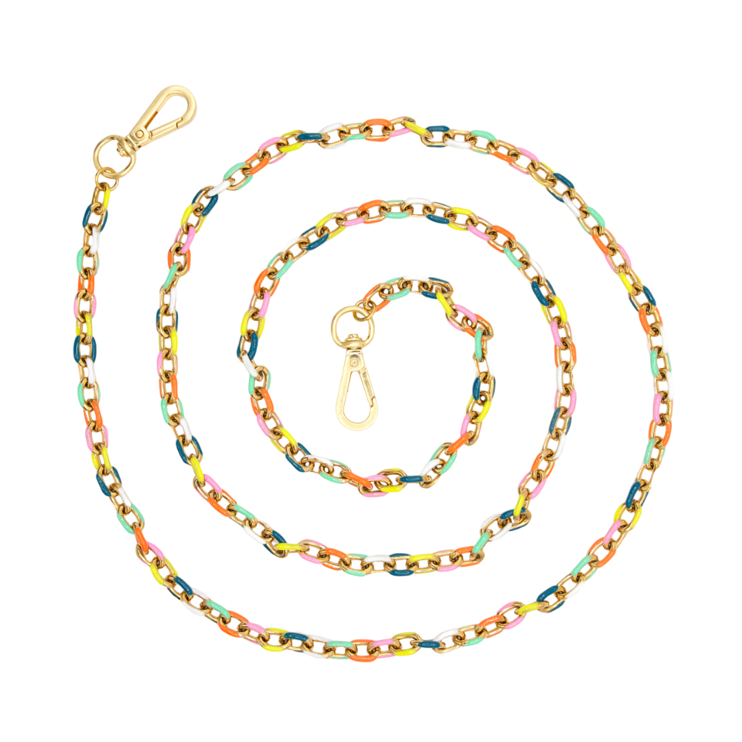 La chaîne MIA est parfaite à porter au quotidien et en soirée. Une partie de chaque maillon de la chaîne est en émail coloré. Grâce aux 2 mousquetons tournants, elle peut être fixée facilement à toutes nos coques. La chaîne présente une longueur de 124 cm (mousquetons inclus) et peut être portée en bandoulière ou en collier. Elle est confortable à porter et personnalise votre étui de portable à merveille.